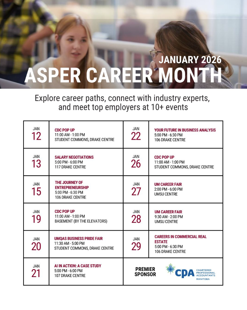 The Asper's Career Development Centre is kicking off the new year with 10+ events designed to help you explore career paths, build industry connections, and meet top employers. From salary negotiations and entrepreneurship to AI, business analysis, and commercial real estate, there's something for every student. All Students from all faculties are welcomed to attend! Registration is not required!